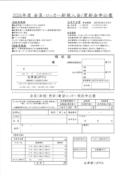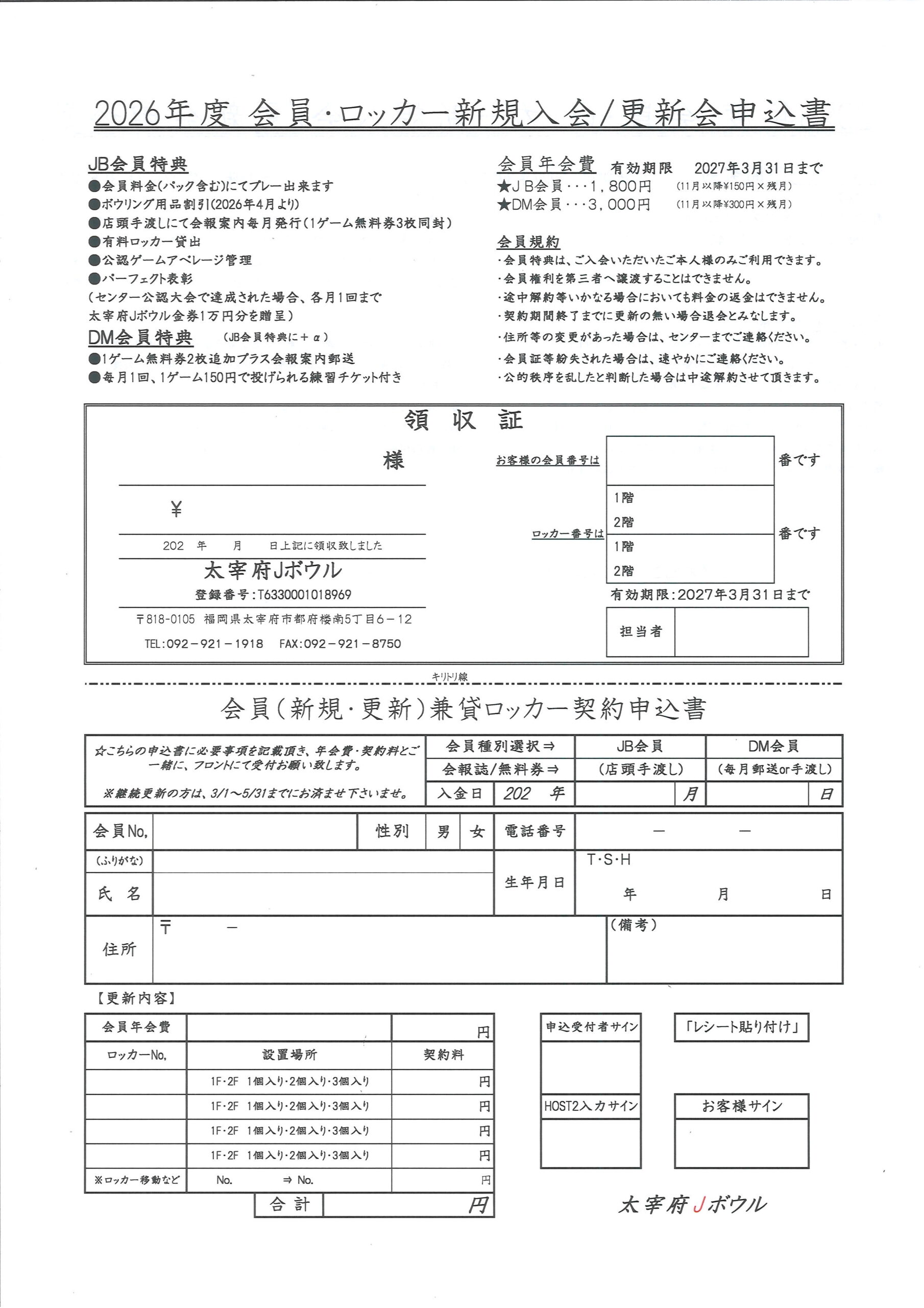 いつも大宰府Jボウルをご利用いただき誠にありがとうございます。 会員更新とご契約のロッカー更新期限が3/31迄となっております。 JB会員特典 ・会員料金(パック含む)にてプレーできます。 ・ボウリング用品割引(2026 …